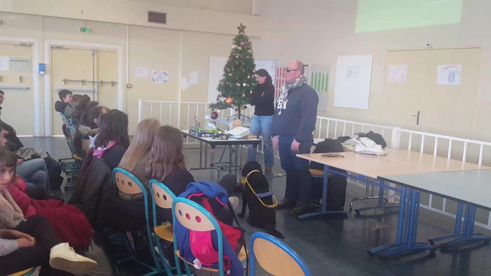 - une intervention de Mme Pila du pôle Handicap de La Seyne sur mer, pour présenter les différents aménagements menés pour faciliter la vies des personnes handicapées : audio-livres, signalisations sonores aux arrêts de bus, aménagements des carrefours, accès à la piscine....Mais également l'intervention d'un agent municipal non voyant et de son chien d'aveugle : Dakota